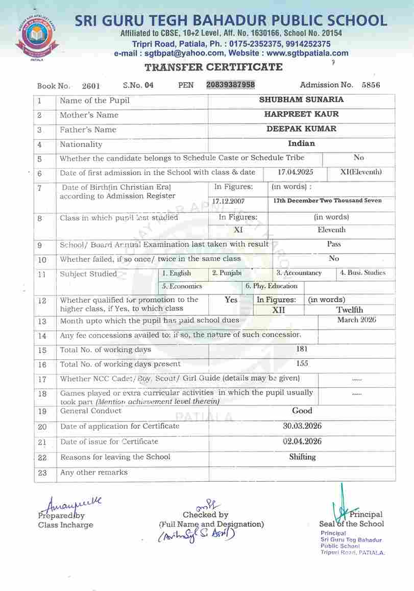 Shubham Sunaria(5856) XI 2025-26