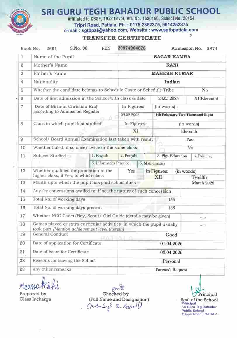 Sagar Kamraj(5874) XI 2025-26