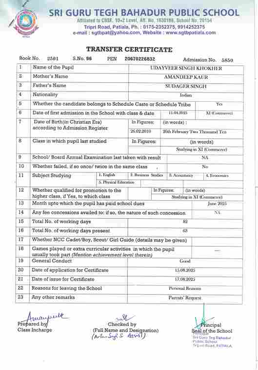 Udhayveer Singh Khochar(5850 ) studying in 11th class