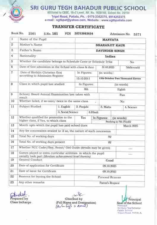 Manyata(5371) Studying in 9th (2025-26)